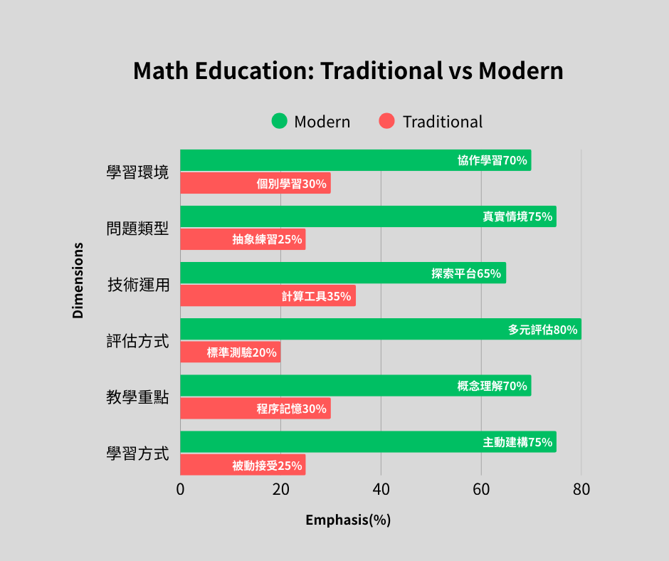 而現在的教育趨勢,更強調讓學生主動探索、動手操作,並透過真實情境來學習數學。像是利用科技工具、設計生活化的問題情境,或鼓勵學生討論與推理,都是提升學習動機和理解力的好方法。
