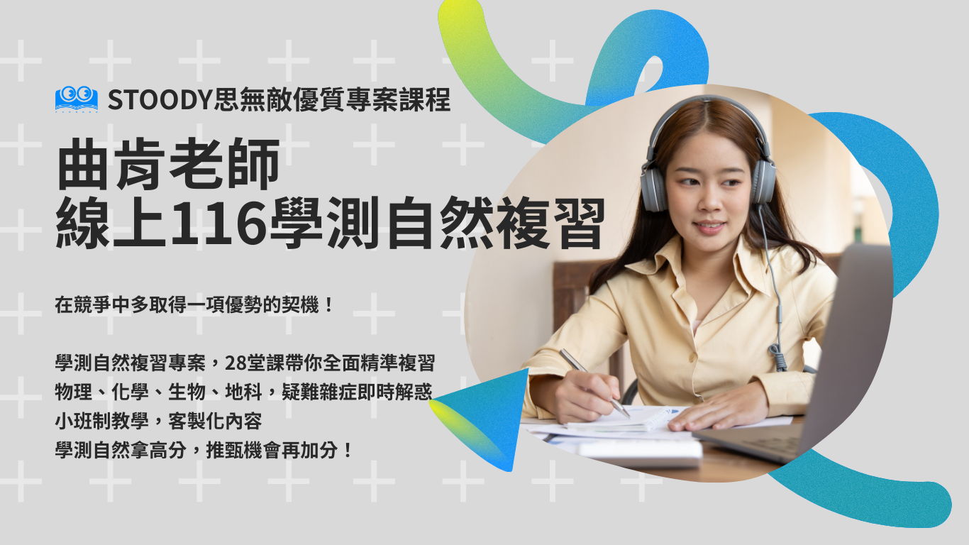 與STOODY思無敵雲端教育長期合作,頗受學生家長好評的曲肯老師,特別為同學們打造為期28週的「116學測自然複習專案課程」。